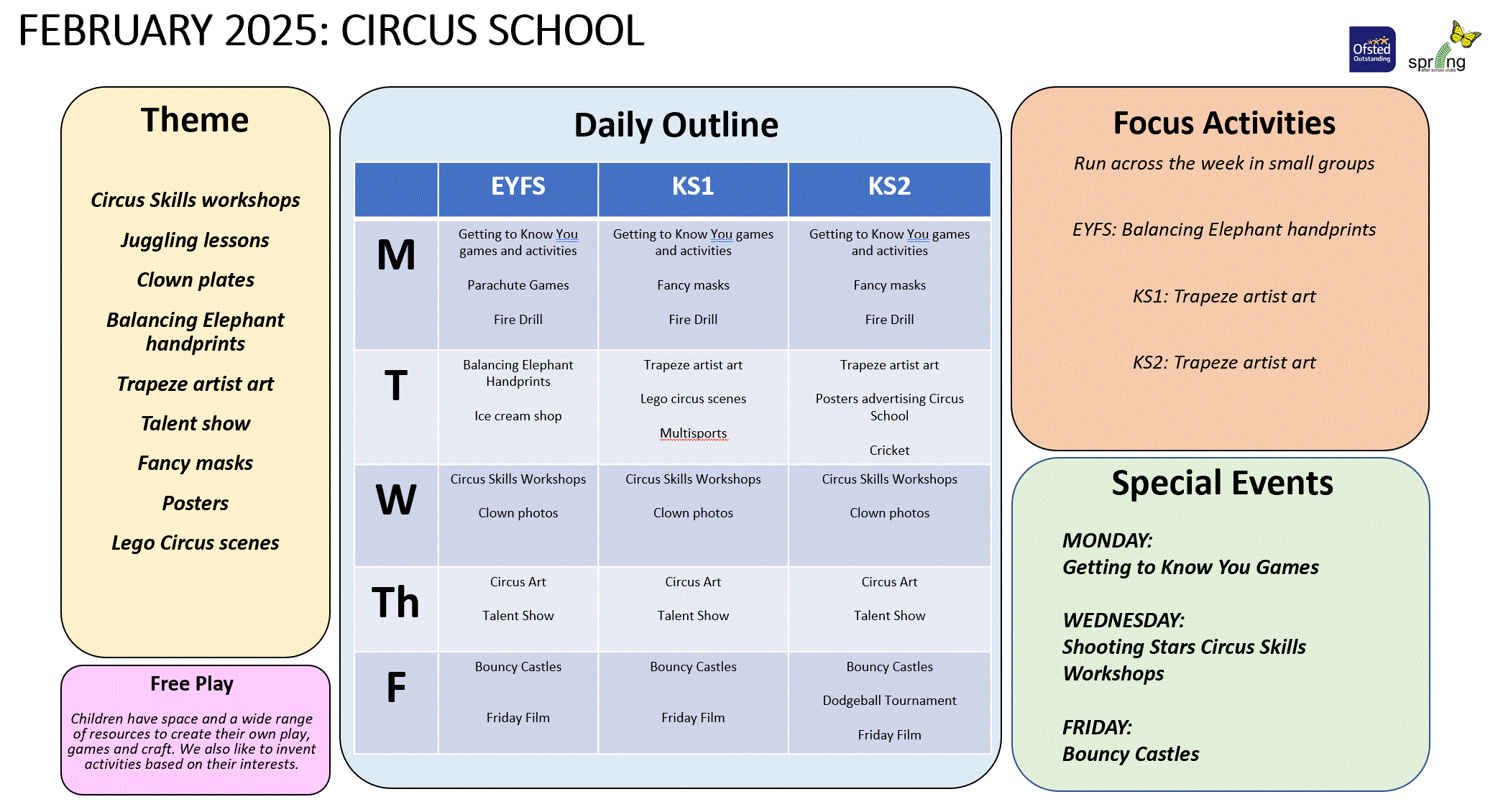 We run clubs at October Half Term, February Half Term, 2 weeks at Easter and for 4 weeks over the Summer. We do not run clubs over the Christmas break or in May half term.