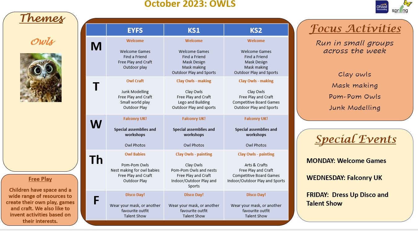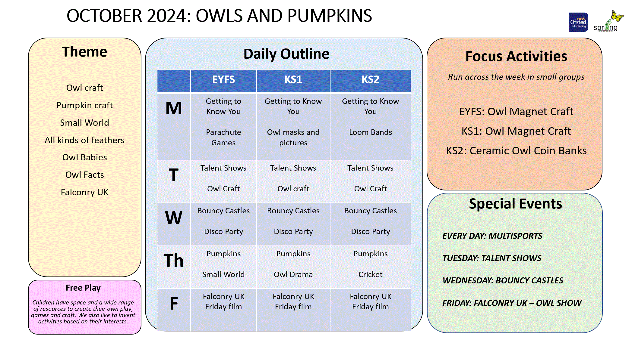 Owls and Pumpkins. Owl craft, bouncy castles and a visit from Falconry UK on Friday.