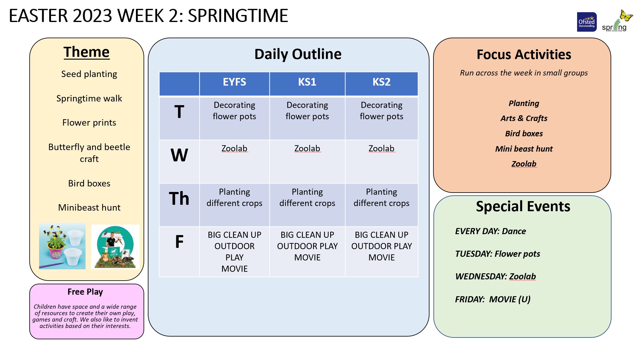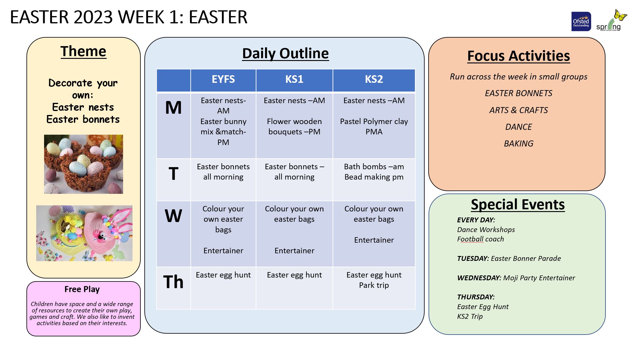 For Easter 2023 we have a range of activities and exciting events planned as well as our usual themed crafts and free play. On Wednesday 5th April we will host Moji Party Entertainers, with a disco, bubble machine, snow machine and photo booth! On Wednesday 12th April Zoolab will be visiting us, and bringing some little furry (and not so furry) friends with them. We also have our dance teacher and a football coach daily.