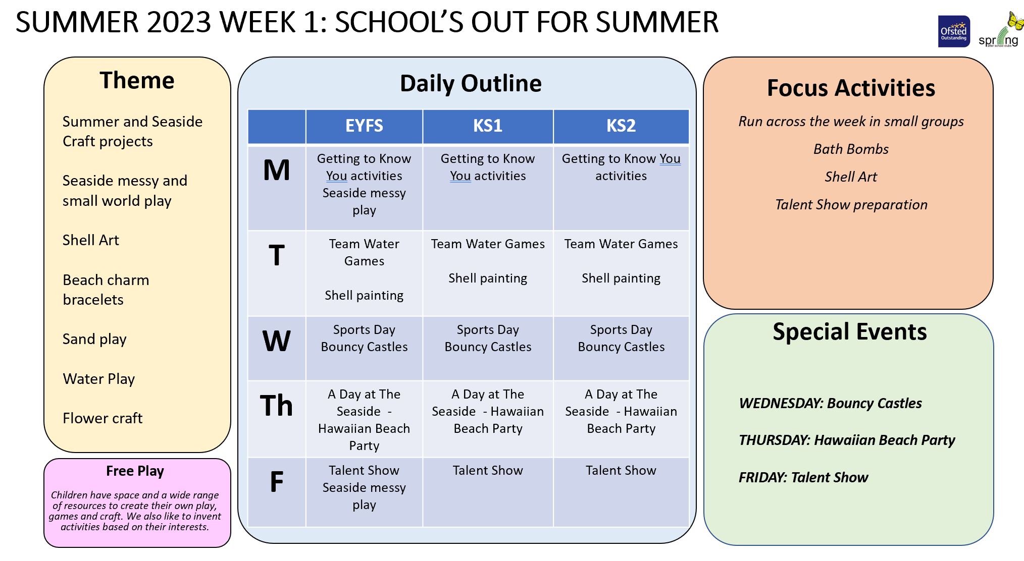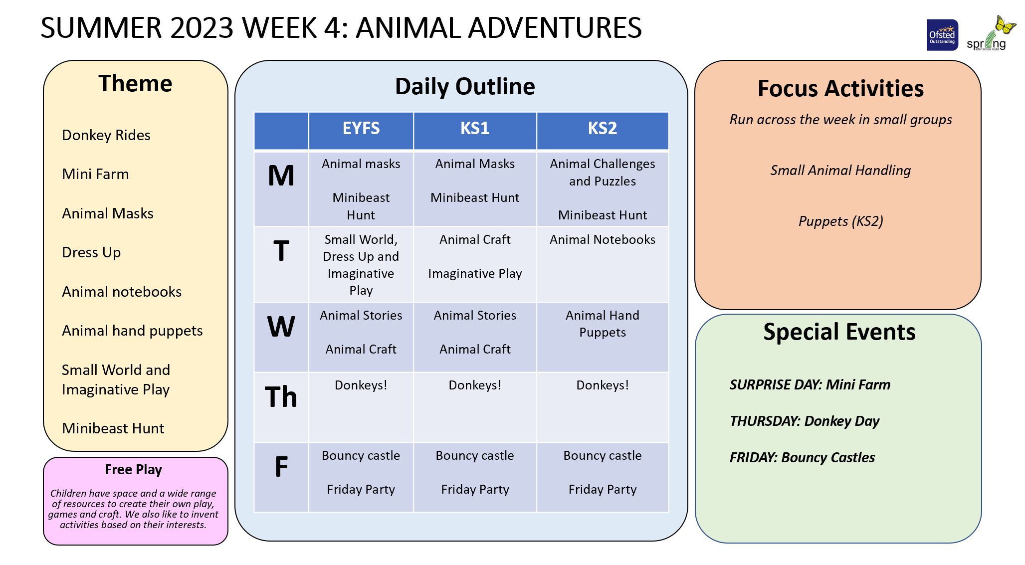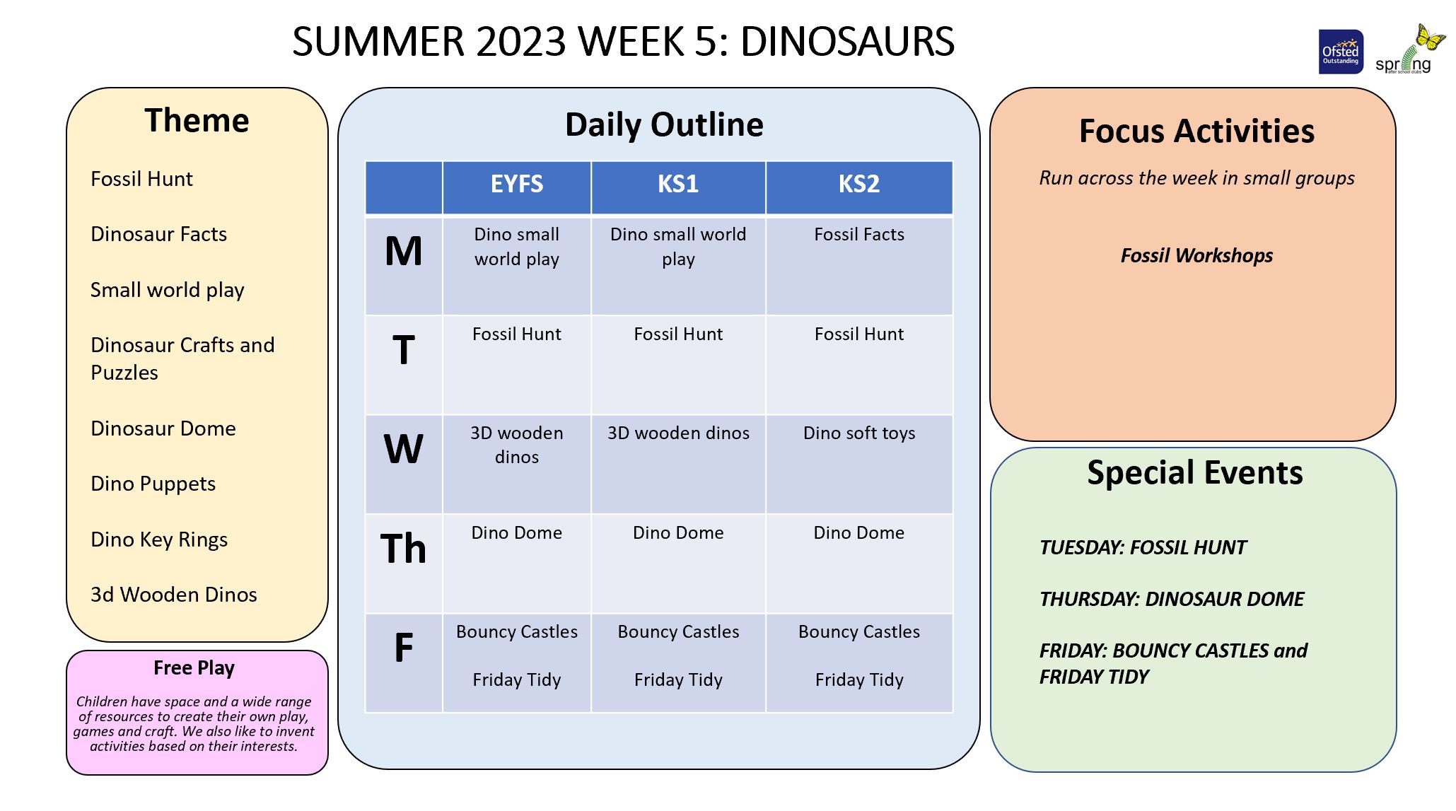Oh, we enjoyed planning our summer weeks this year! We have weekly bouncy castles, a Hawaiian Beach Party, donkey rides, a clown school, an incredible Dinosaur Science Dome, and much much more in store! Our overview planning is below: