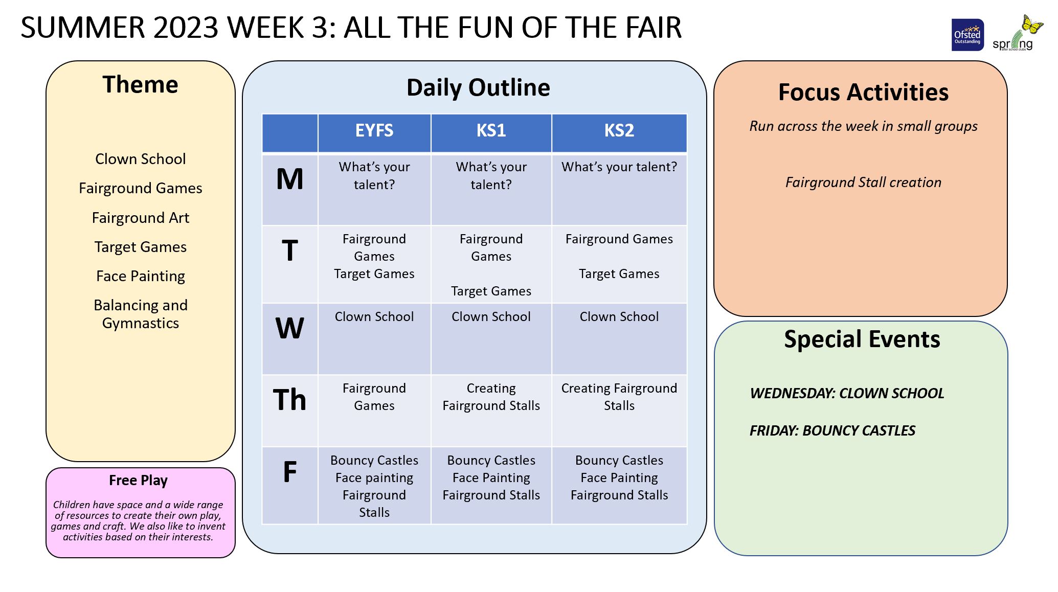 WEEK 2: (5th August-9th August): ALL THE FUN OF THE FAIR. We will be exploring the fairground theme, building up to creating our own fairground stalls and holding our very own Fair.